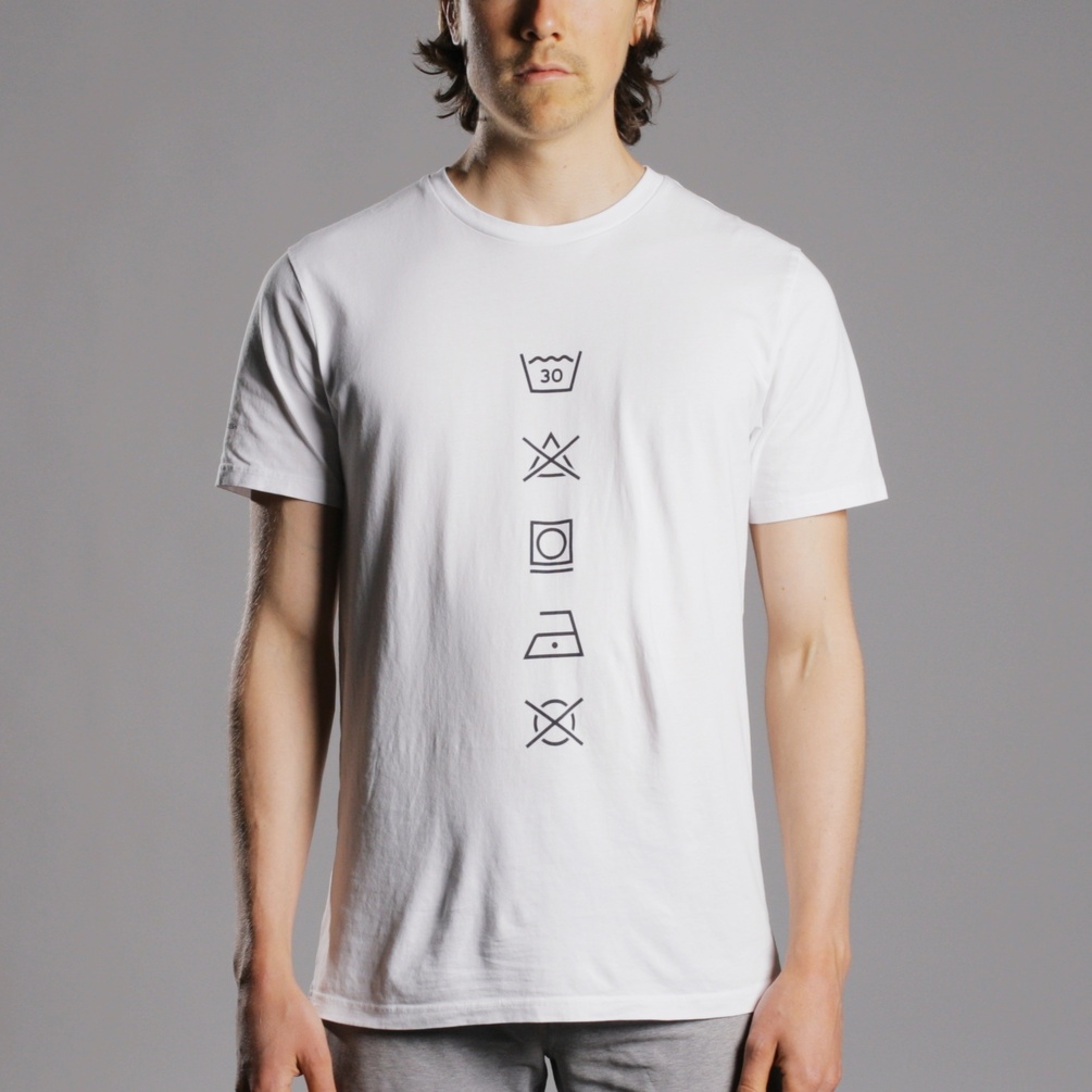 An organic cotton unisex t-shirt featuring washing instructions, material information, and country of origin on the outside.